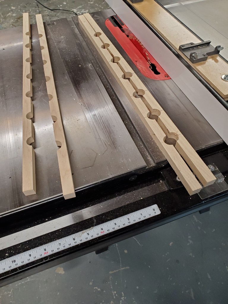 It starts with a couple of pieces of 1 1/2″ wide wood laying out 1″ diamter holes down the middle. The holes are 3″ apart on center. I taped the two pieces together so that when the holes are bored, the pieces mirror eachother.