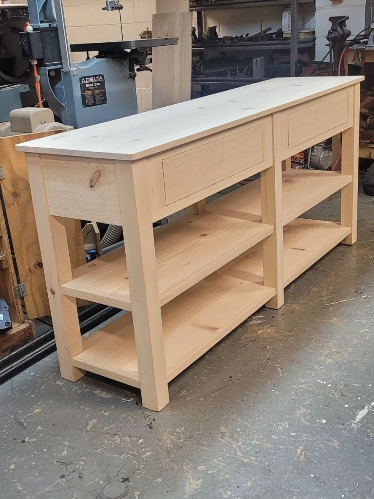 She wanted the piece to be made of a light colored wood but didn’t want maple or poplar. We went to Lowes and bought a bunch of 1×12’s that were a light pine made in Sweden. Being that they were from Sweden, I assume that it’s the same pine that IKEA uses in their furniture.