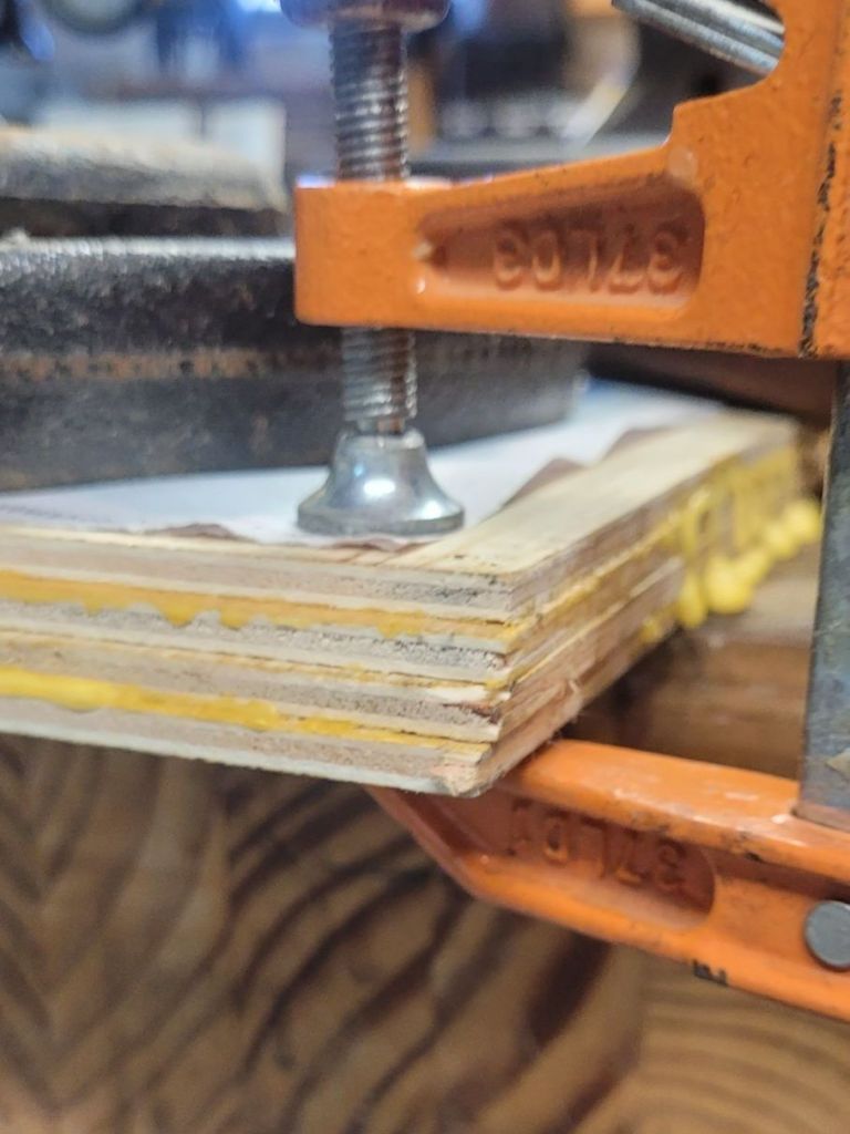 Once the base was made, I focused on the top. I wanted the sides to have a thicker panel in the middle of them, so I glued up the 1/8″ panels together. I used as many clamps I could find and stuck newspaper between the two panels so they wouldn’t stick together. Luckily, when the panels dried, I was left with two oversized panels for the sides of the cabinet.