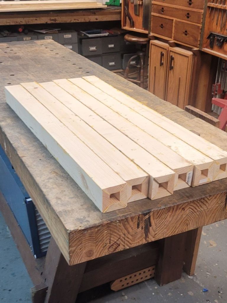 The first thing I did was make the legs by glueing up boards into a square. There’s a special lock miter router bit for this purpose but I have always heard that your stock has to be completely straight and flat in order for the bit to work well. My boards were neither, so I opted for 45 degree cuts and a lot of clamping pressure with band clamps and duct tape. Fortunately, they came out fine.