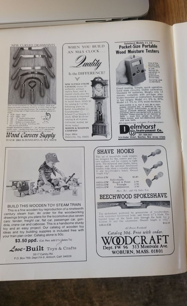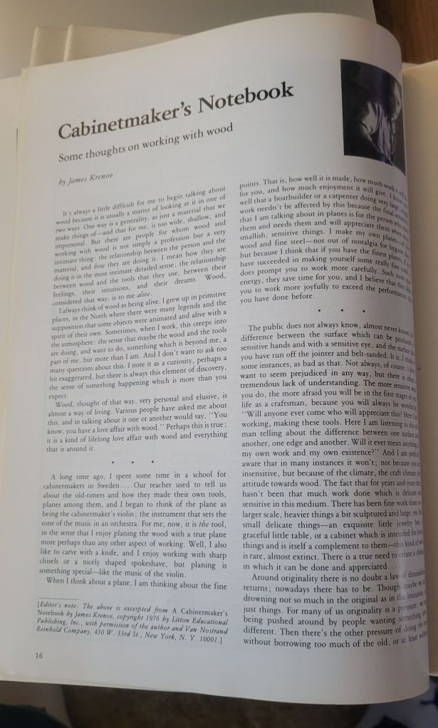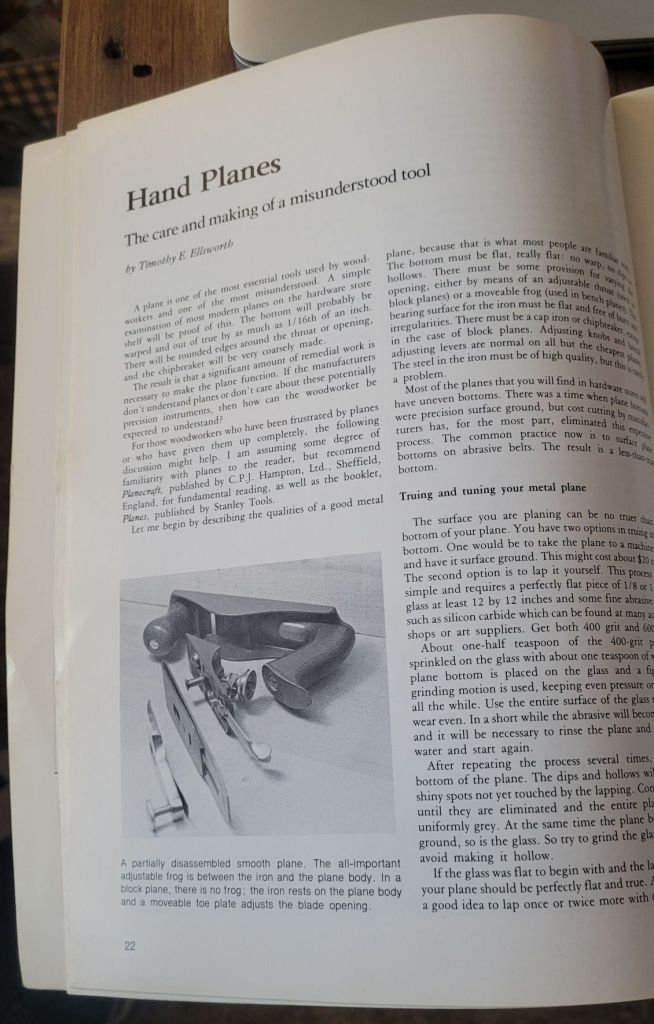When I got home, I looked through the issues and read some of the articles. The first issue of Fine Woodworking had an article near and dear to my heart. Hand planes, with the caption “The care and making of a misunderstood tool.” This shows you how this was the very beginning of a magazine dedicated to woodworking if the common woodworker thought of a hand plane as being a weird foreign object.