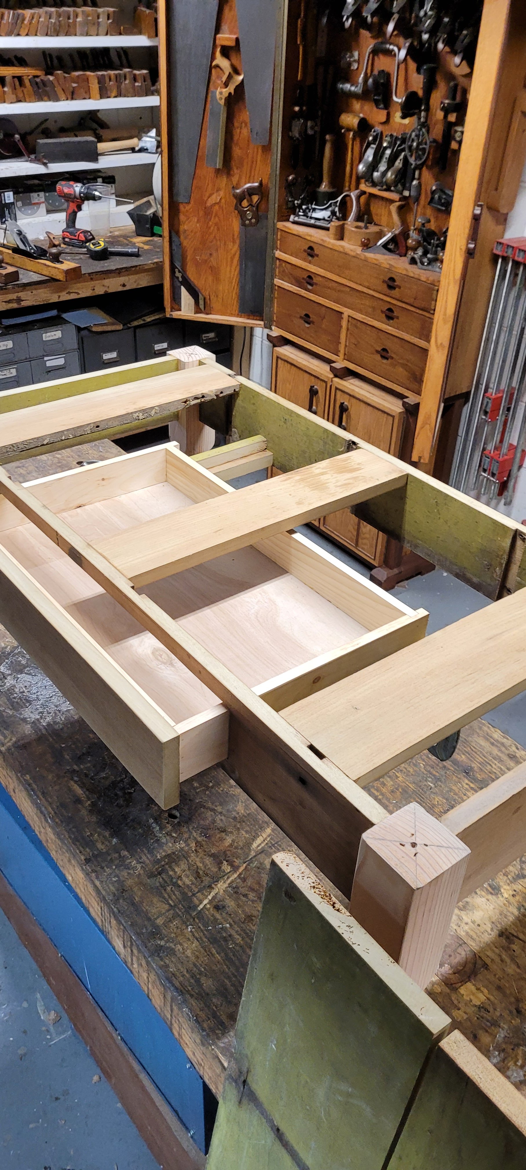 So I took the drawer face off the stupid faux drawer and decided to rebuild the whole thing with some white pine .