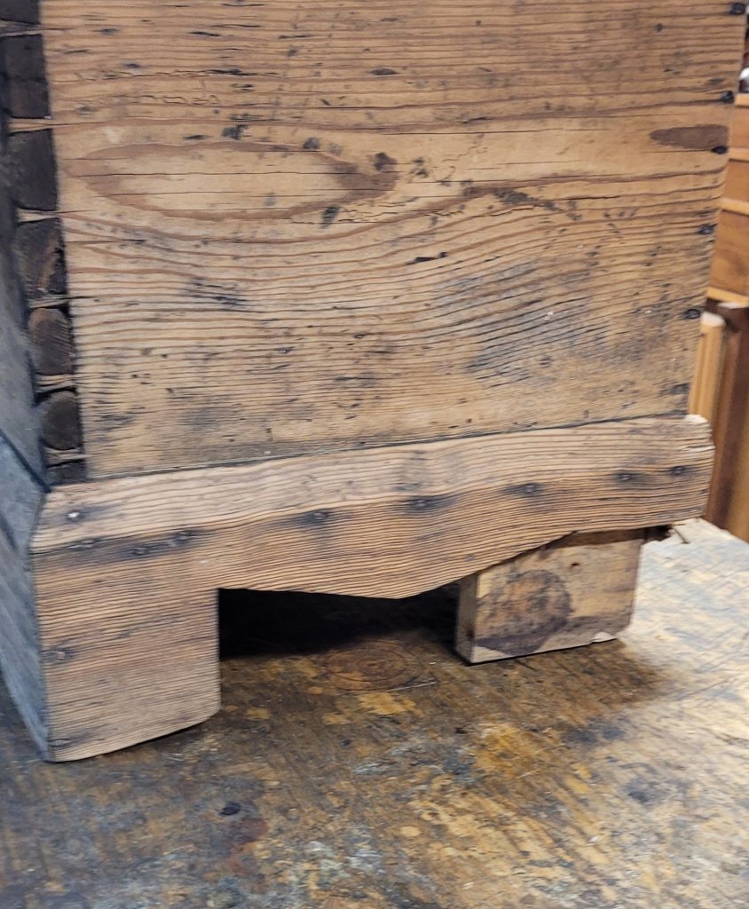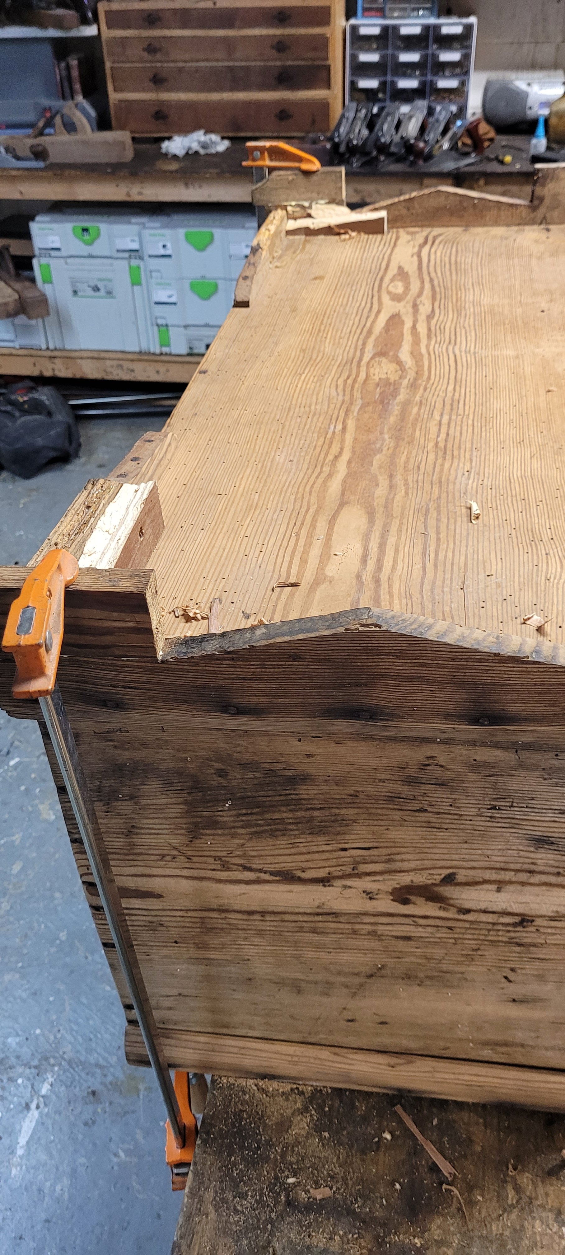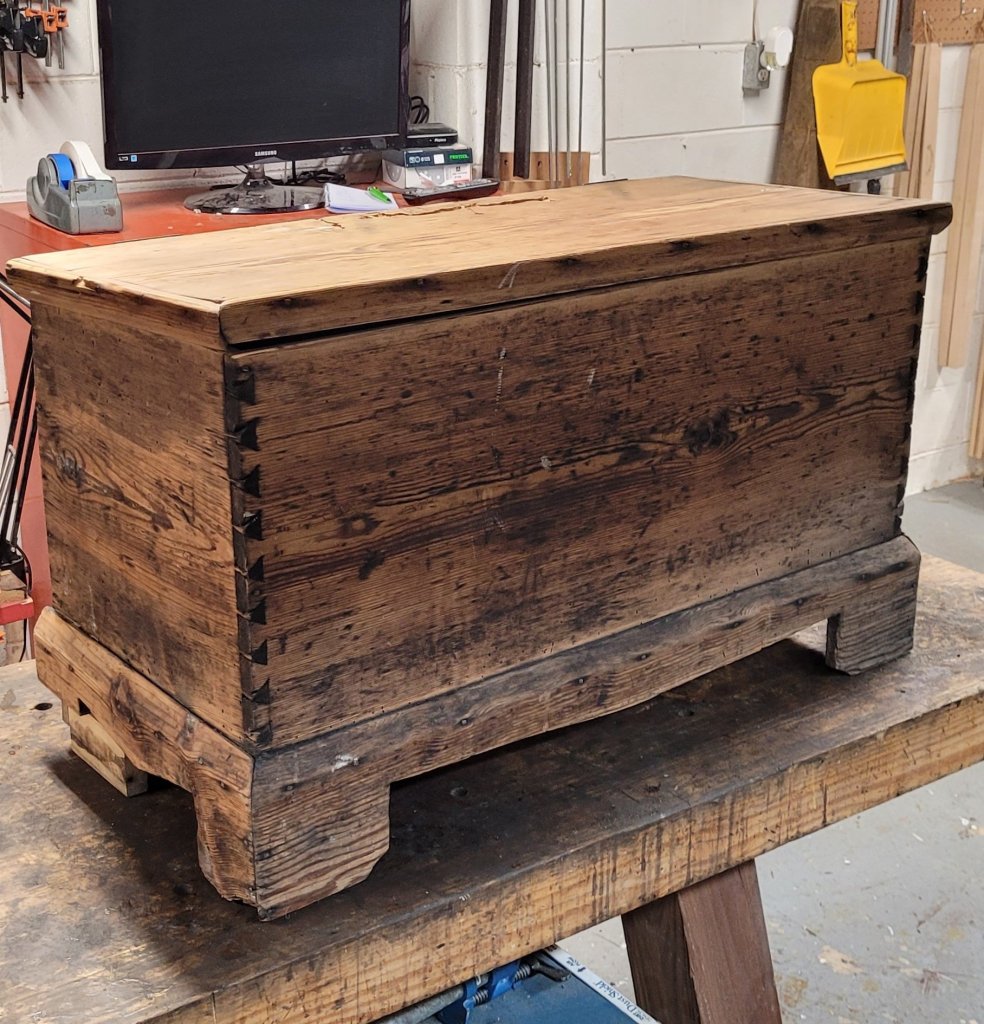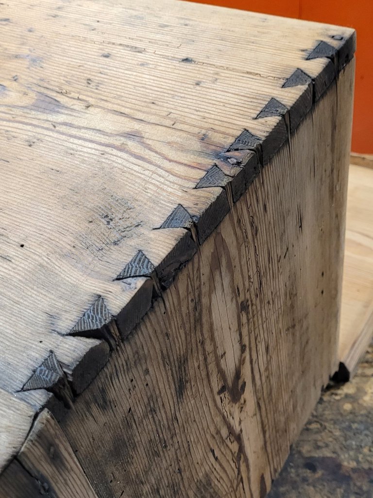 Basically, what I did was scribe the pins onto the drawer side and cut tails into the wood. No different than making a drawer from scrap. The only difference is that not all the pins survived over the years, so there are ghost pins within the drawer side.