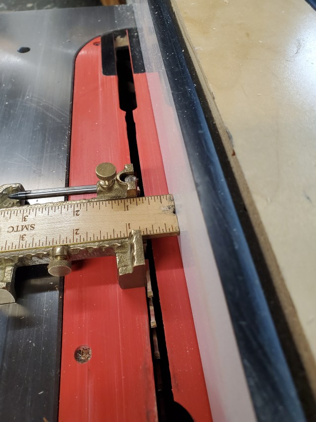 I wanted to use mortise and tenon joinery to attach the frame to the legs. so I set my mortising gauge to 3/8″ wide, the same width of my mortise chisel.