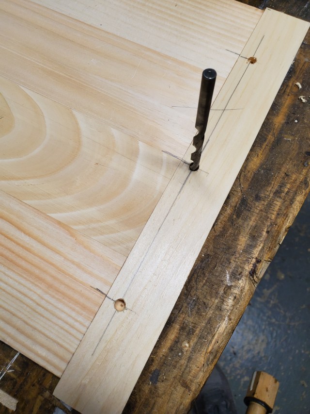 Next I used a 3/8″ forstner bit and drilled down the depth of the mortise. Doing the mortise this way allowed me to not have my drill bit sway outside the mortised area.