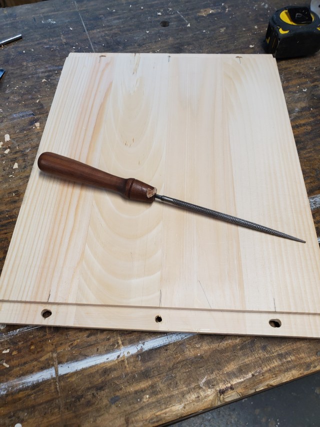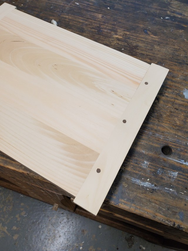 Using one of my beading planes, I planed a 3/8″ bead down the bottom of the frame boards. Cutting a bead on a seven-foot long board takes a bit of patience.