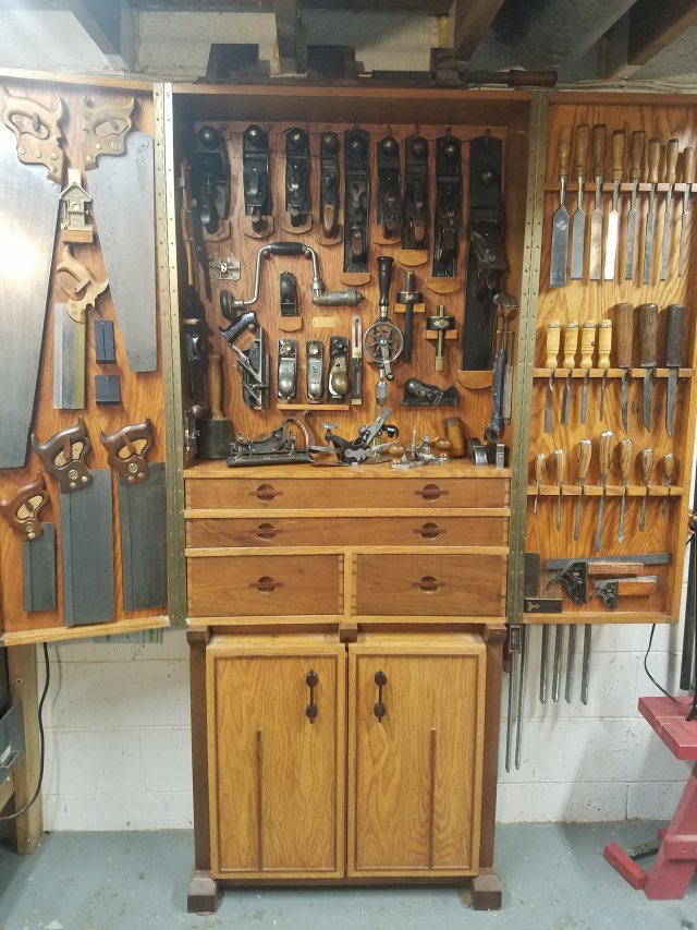 The king of the shop is my tool cabinet which I finished building in 2001. The inside has changed a lot over the years as I added to my tool collection. I doubt it’ll ever be finished as I’m constantly buying new tools to put in it and selling the tools I don’t use that much. It sits behind my workbench for easy access. The majority of the tools in the cabinet are antiques that I restored but I do have some brand new tools in there like a Lie Nielsen dovetail saw and a Veritas shoulder plane.