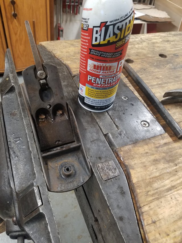 Every once in awhile I’ll buy an old tool that gives me some grief. This time it was the frog that wouldn’t come off the bed of a Stanley No 4 plane due to some rusted screws. Normally, when screws won’t budge, I use the oldest trick in the book, and tighten them before I try to loosen them. This will often break the seal of rust and allows me to unscrew the bolt with no problem. But that didn’t work this time. Not even a shot of PB Blaster could save the day.