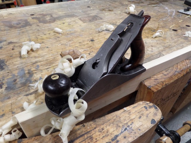 Setting the cap iron back on the blade about 1/8″ behind the cutter, I stick both back on the plane to see how it cuts. With a little bit of work, I was able to get whisper like shavings from the plane without buying a new blade or even worrying about flattening the bed with sandpaper. I brought the plane with me to the meeting and used it on a scrap piece of poplar to show how the plane performs. I then passed the scrap wood around the audience so that they can see how smooth the plane made the wood.