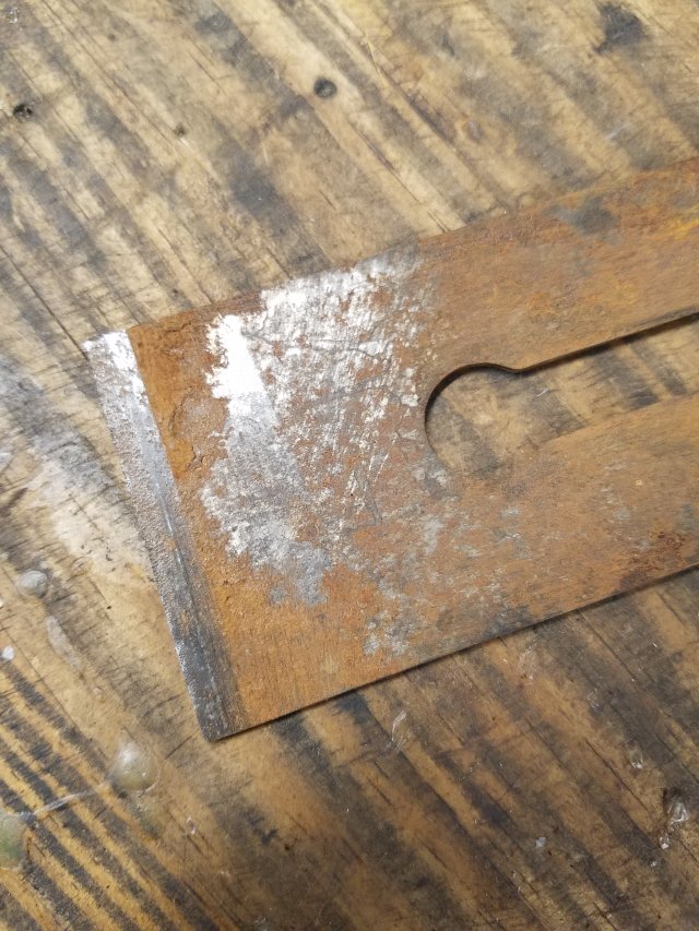 Every once in awhile I’ll come across a plane blade that is so heavily pitted and corroded, the best thing to do is to simply throw it away. This blade that came off a Stanley No 6 plane was no different. The problem was that I didn’t have a replacement blade to go with the plane I was restoring, so I was forced to see if I could get the blade to work again.
