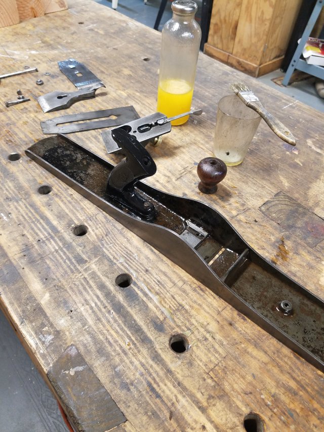 I ended up deciding to take the blade and lever cap from the old plane and put it on my new 5 1/4 plane and keep this one in my tool cabinet bidding the old brazed bed goodbye. After I cleaned all the parts, the plane came out pretty nice.
