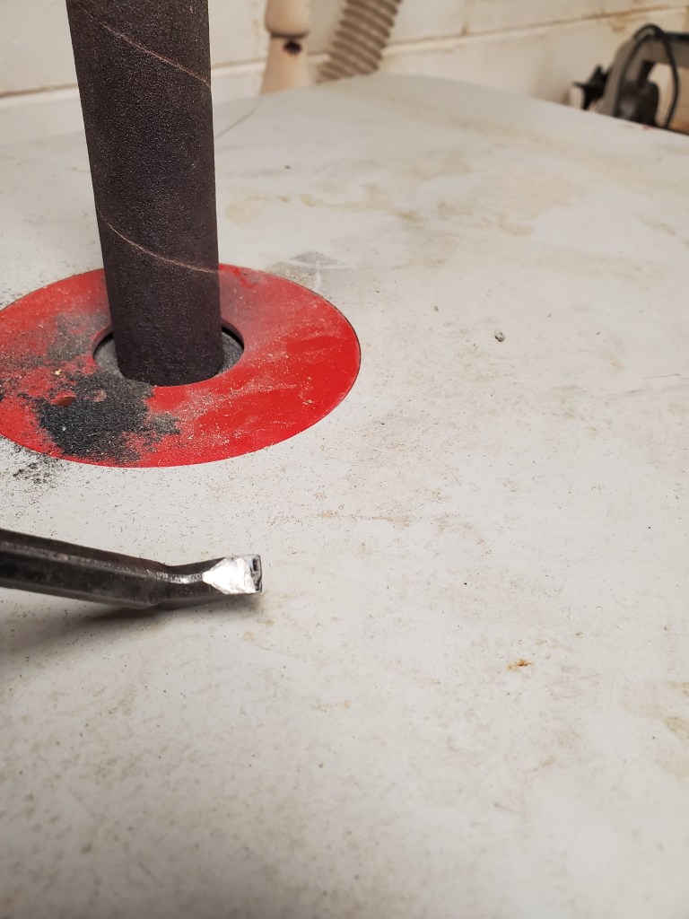 On Salko’s post, one of his followers posted that a popular woodworking blog-gist, Derek Cohen, sharpens his router plane blades with a drum sander so I had to try that out as well. Below is the blade I’ve been using in my router plane for years but never bothered to sharpen it properly. I sharpened this blade the same way as with the block plane blade. I did this just free hand and didn’t bother to make a jig or holding device for it.
