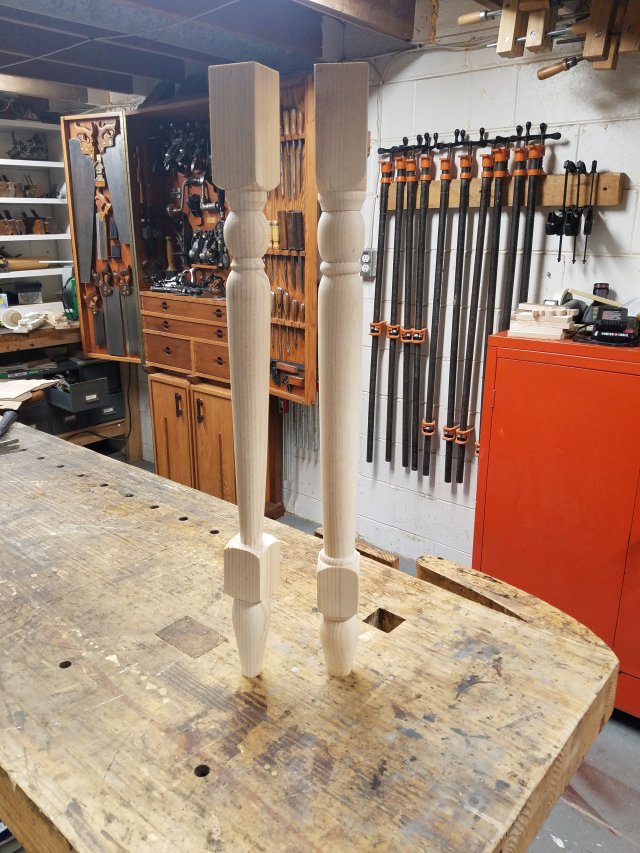 With the wood gluing, I turned my attention to the legs. Taking the 4×4’s I cut them to 30″ and turned a leg that my wife was pleased with.