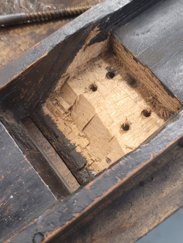 When I got home, I decided to look at the tool chest more closely. It was a pine box dovetailed together with brass hardware on the corners. Inside were mahogany tool bins with veneered banding on top.